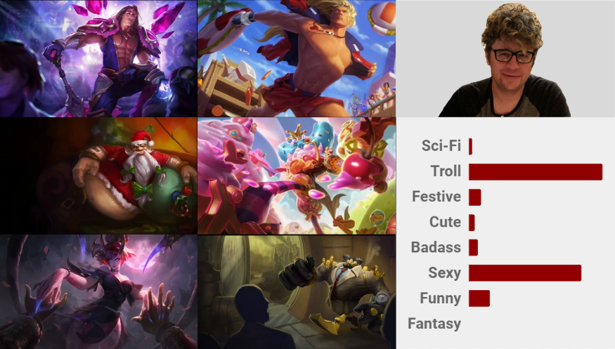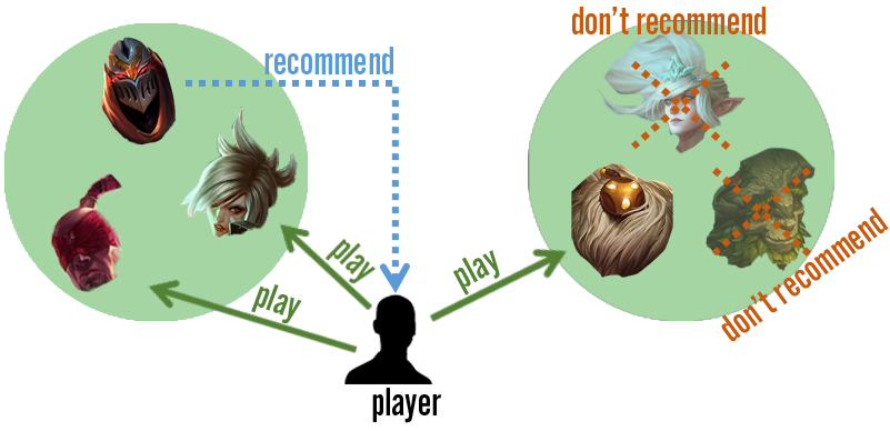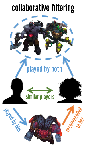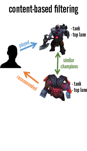 For a content-based system to work, a specific skin would have multiple tags that describe various features of the content; this could be anything from “funny” to “cute” to “edgelord.” In the same light, champions would have labels as well, from basic role categorizations (“ADC,” “Support,” “Mid”) to damage type to humanoid/monster breakdowns. As players start to build up a catalog of content that they own and play, they would start to inherit the traits of those items to create a unique player profile. This profile, along with item features, could be used to rank content that a player would prefer.