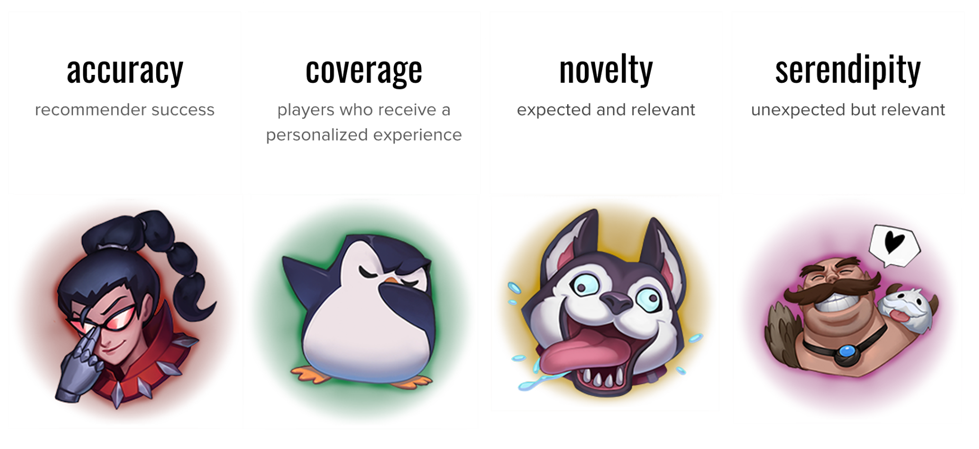 Overall though, accuracy, which drives conversion rate directly, is the most important. Since most algorithms have similar coverage, the balance between accuracy, novelty, and serendipity are the focus of our systems. Accuracy has better short-term effects, as players are shown content they want now and the consensus is that novel and serendipitous recommendations have long-term effects on the entire system. The instinct here is that offering a skin on a champion that a player doesn’t currently play opens the door to a more diverse champion pool and a broader experience with League.