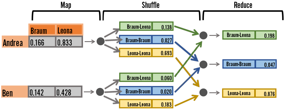We use MapReduce, a common cluster computing model, to calculate data in a distributed fashion. Below is an example of how we calculate the cosine similarity metric - user data is mapped to nodes, the item-item metric is calculated for each user, and the results are shuffled and sent to a common node so they can be aggregated together in the reduce stage.
