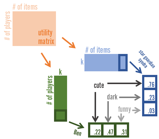 In the image above, we can decompose the number of players by the number of items matrix into two smaller matrices that have the same lower dimensional latent space, k. While in theory these dimensions are complex and not tangible, for representation’s sake we have set k equal to three and labelled these dimensions as “cute,” “dark,” and “funny.” Both the item and player are characterized by this low-dimensional space and we can construct the player’s score for each item through matrix multiplication.