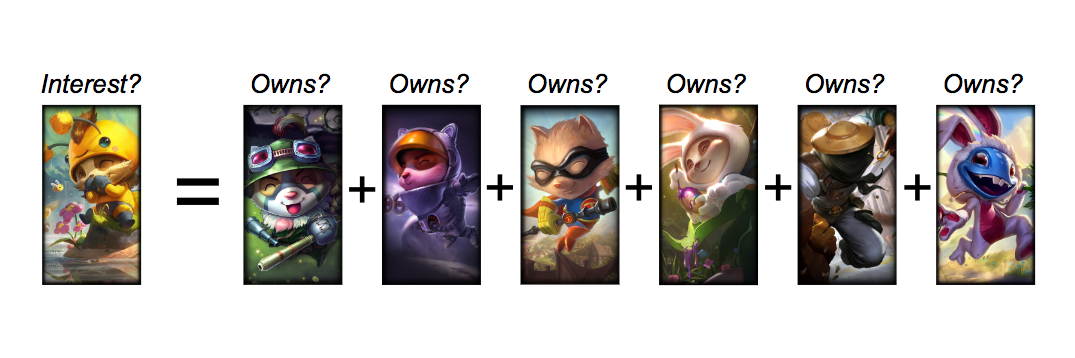 Here, the rating of an unowned skin is determined by a linear combination of owned skins and their weights. In essence, this means a linear regression is trained for each piece of content in the game. These models, alongside each player’s ownership profile, determine the rating for each unowned skin for that player. The only missing piece left to explain is the regularization component, which is an additional constraint added to the regression that encourages a majority of the beta coefficients to be shrunk to 0. The intuition here is that, for each item, only a small number of remaining items are important towards the rating of the item being scored. For instance, the model for Beemo would likely have non-zero coefficients only on other Teemo skins, Beekeeper Singed, and a few close neighbors. In general, this regularization ensures that models aren't overfit to noise in the data and the sparsity across coefficients makes scoring items more computationally efficient.