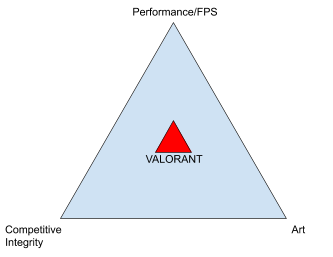 Each game has different pillars depending on what the development team is trying to accomplish. For VALORANT, we picked these three pillars as the most important (instead of, say, realism, immersion, or cinematics) so we want to make sure we’re ending up evenly in the middle of this triangle.