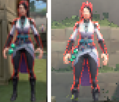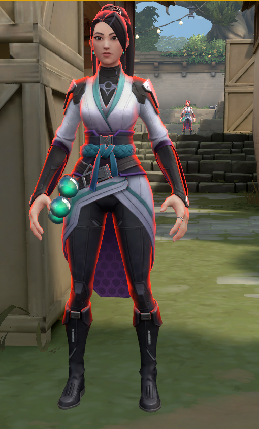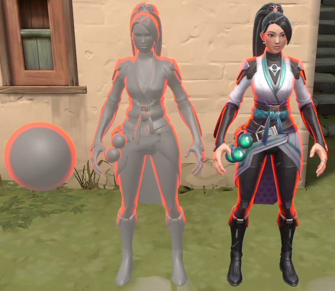 To add clarity to characters in VALORANT, we add extra lighting on grazing angles of the character (the angles facing away from you) to create a silhouette effect. This light is colored and styled differently for allies and for enemies - enemies have a red fresnel, and allies have a neutral, blue fresnel.