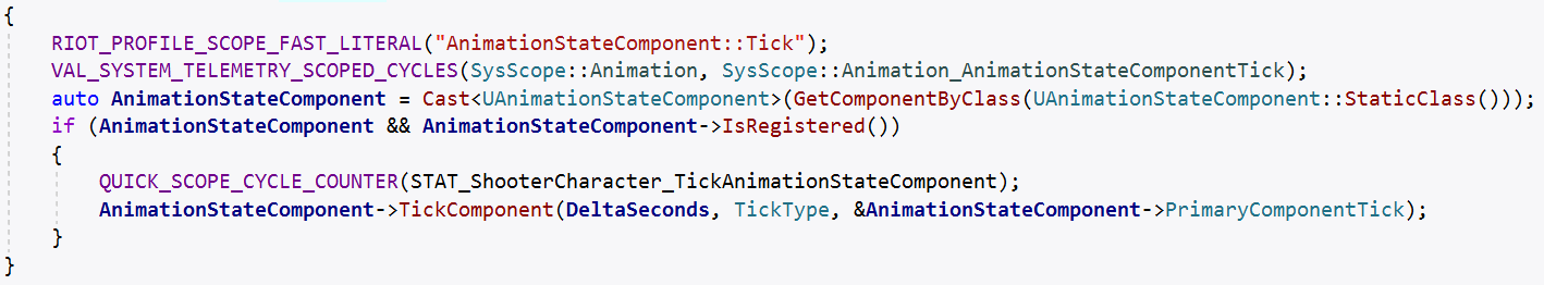 Armed with this list, we built a system that allowed programmers to easily mark up game code and categorize them appropriately. Every line of code that executes is scoped to one of the above buckets using a macro system, and we added a concept of subsystems for finer grained analysis of larger systems. We called the system ValSubsystemTelemetry.