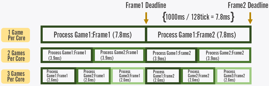 When we think about hosting servers at a 128-tick rate, our biggest constraint is CPU resources. We need to be able to process an entire frame within 7.8125ms, but if we do that, a single game would take up an entire CPU core!