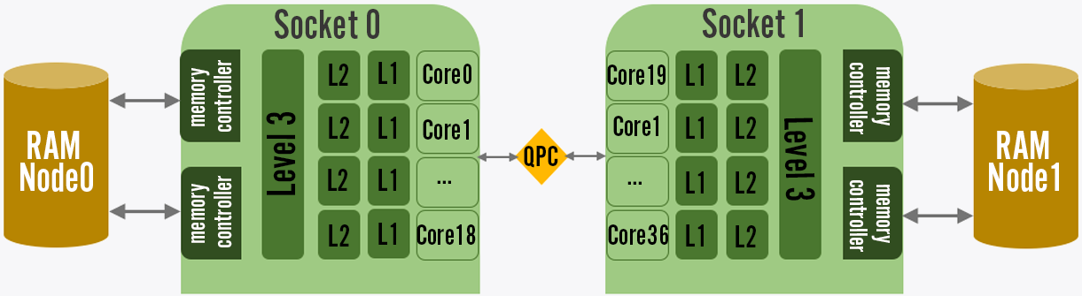 We wanted to push our memory performance even further. First, you’ll need to understand another aspect of modern CPU architecture called Non-Uniform Memory Access (NUMA). On server architectures, you often run dual (or more) socket CPUs. Each of these sockets has direct access to a portion of the system’s RAM, and shares data through an interconnect. This allows for increased memory bandwidth (2x more connections), but the interconnect can become a bottleneck. Revisiting the diagram above, you can see a simplified layout of a NUMA architecture with two sockets. If only the operating system could make sure to allocate memory and CPU resources to keep interconnect traffic down...