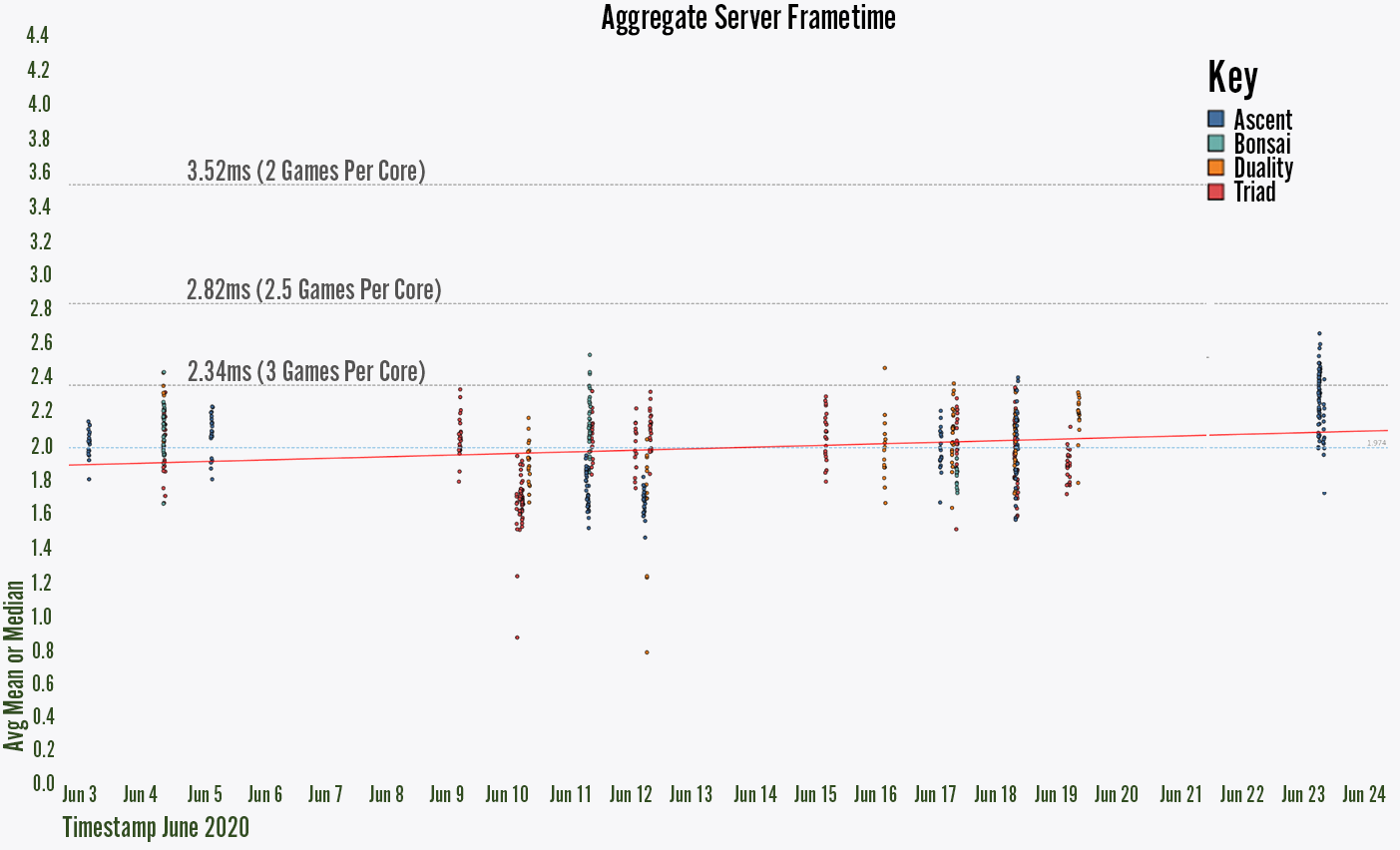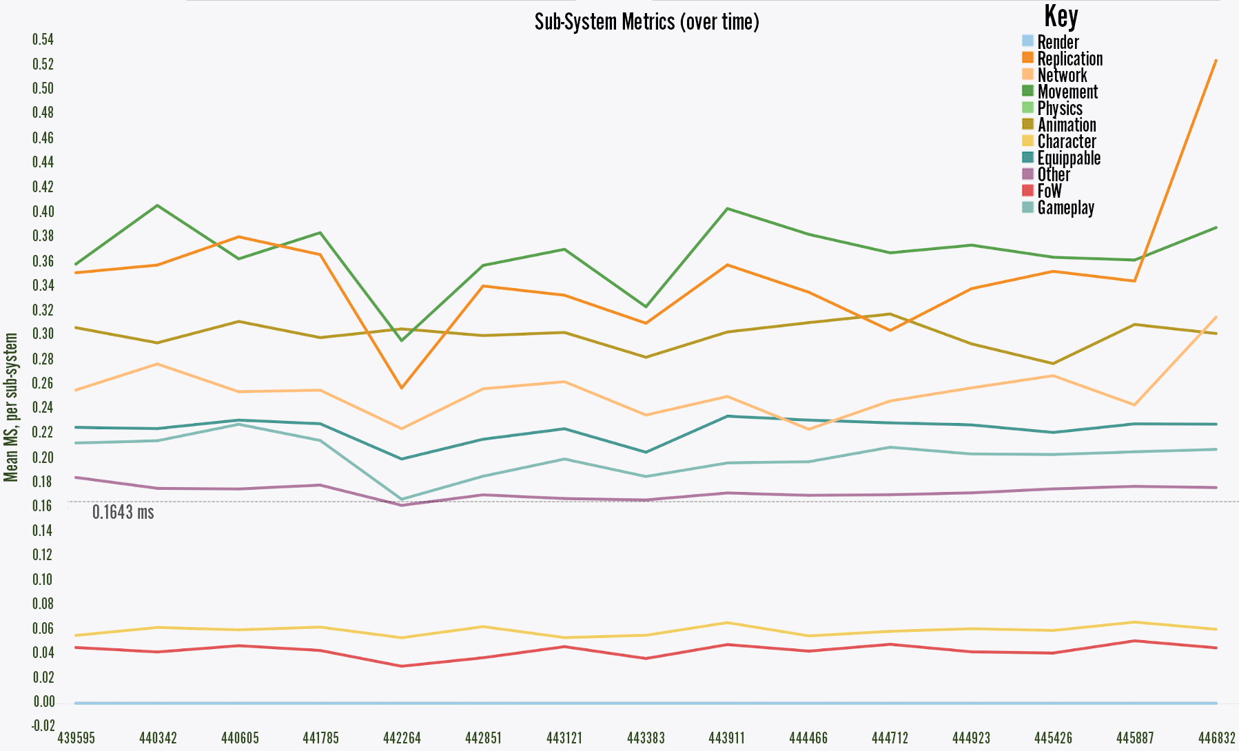 Without data like this, it’s easy for non-performant code or content changes to make it into the game undetected. We might go weeks before these sorts of changes stack up to a breaking point where developers or players notice things slowing down.