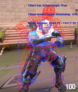 The red wireframe shows the server’s non-animated hitbox vs the client’s blue.