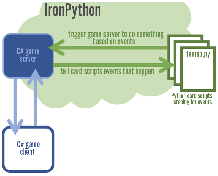 A huge benefit of IronPython is that we can access C# objects and call C# methods directly from a script. It’s the glue that connects our C# game engine to our Python card scripts. If a designer has a unique, new gameplay action they'd like to try out, they don't need an engineer to build something first.