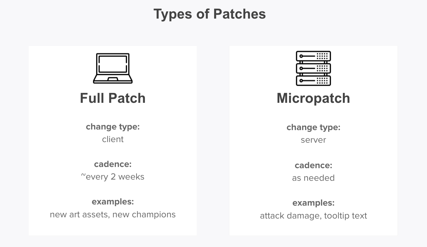 Full patch: These are for client changes, the more extensive kind of download. We release at least one of these every 2 weeks to patch and balance the game. This is required for any kind of large change such as art assets or champion additions.