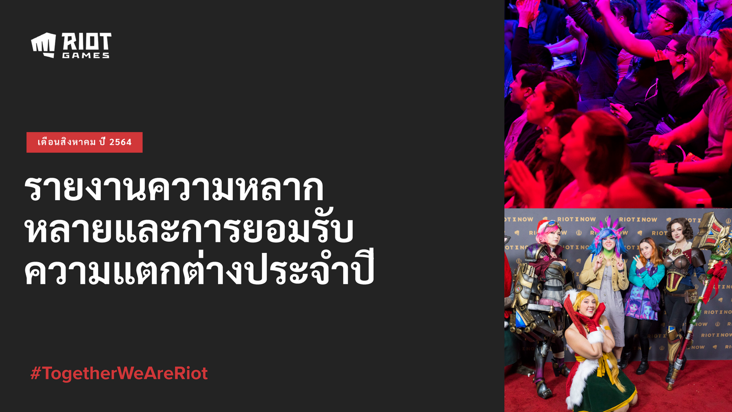 ตั้งแต่เริ่มต้นเส้นทางในการมุ่งเน้นเรื่อง DEI เราได้ให้คำสัญญาไว้ว่าจะอัปเดตคุณเกี่ยวกับความก้าวหน้าของเรา เราได้สร้างรายงานนี้เพื่อแบ่งปันให้คุณทราบถึงความสำเร็จที่ทำได้ รวมถึงความท้าทายที่เราจะยังต้องก้าวข้ามไปให้ได้ ไม่ใช่แค่เพียงที่ Riot Games เท่านั้น มันยังมีอีกหลายอย่างให้เราต้องทำในอุตสาหกรรมนี้ เป็นความรับผิดชอบของเราที่จะทำให้สถานที่ทำงานของเราปลอดภัยและทุกคนมีส่วนร่วม ไม่เพียงแค่สำหรับคนจำนวนหยิบมือ